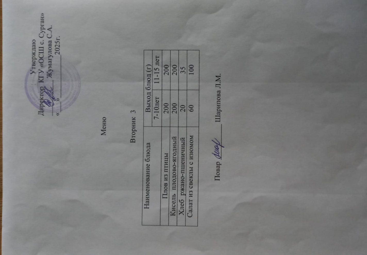 Мектеп асханасының 2021-2022 оқу жылына арналған тамақтану кестесі