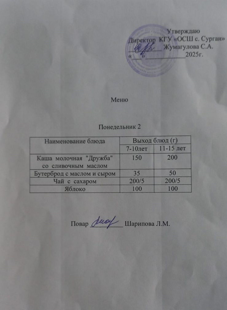 Мектеп асханасының 2021-2022 оқу жылына арналған тамақтану кестесі