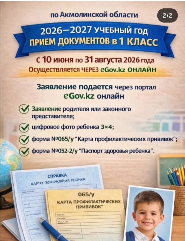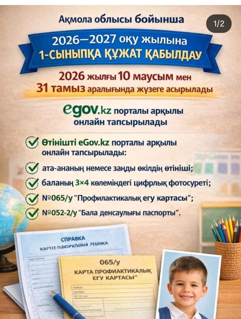 2026–2027 оқу жылына 1-сыныпқа құжат қабылдау Ақмола облысы бойынша 2026 жылғы 10 маусым мен 31 тамыз аралығында жүзеге асырылады. Өтінішті eGov.kz порталы арқылы онлайн тапсырылады.